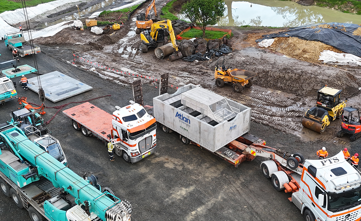 Atlan BaffleBox® is a precast concrete GPT (Gross Pollutant Trap) containing a series of sediment settling chambers separated by baffles.